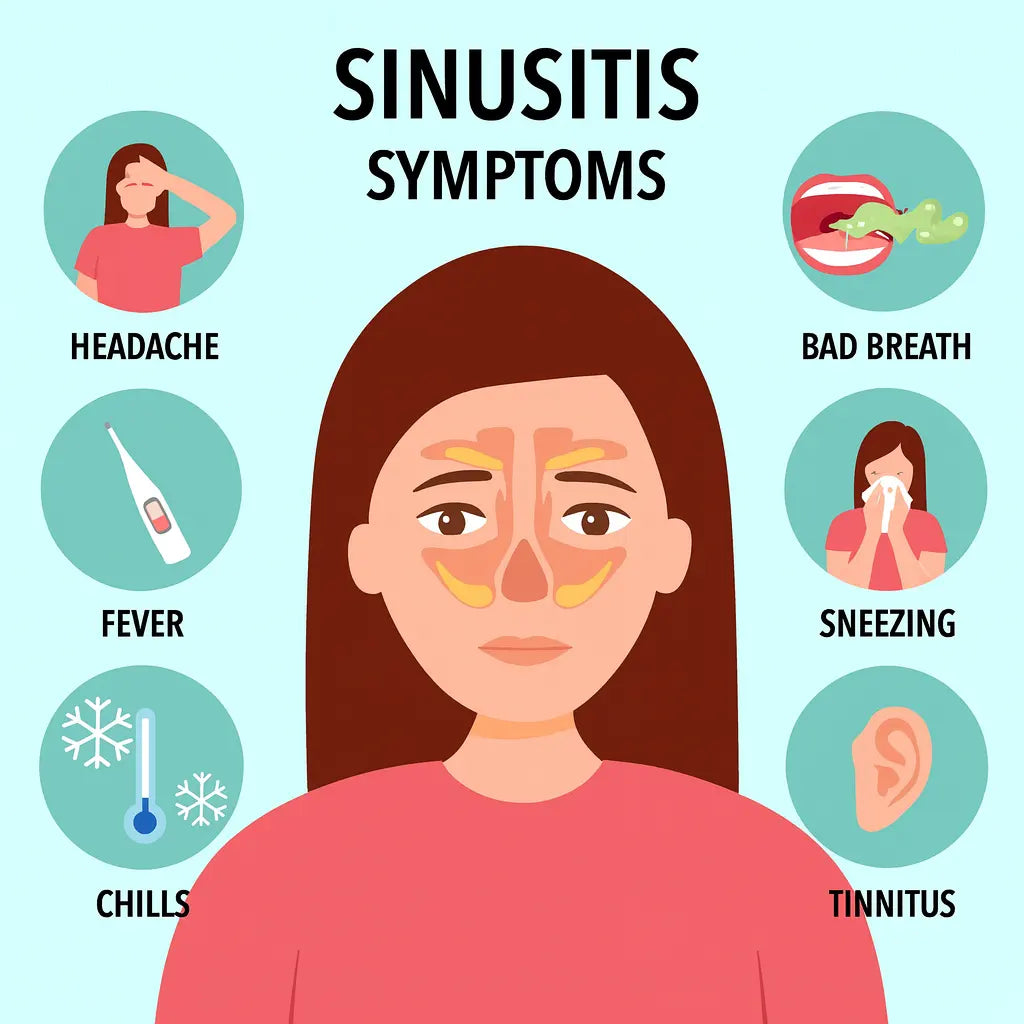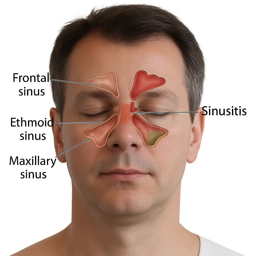 Sinusitis (sinus infection) happens when the sinus lining becomes inflamed and blocked due to colds, allergies, or infection. This causes mucus buildup, leading to pressure, pain, and difficulty breathing.