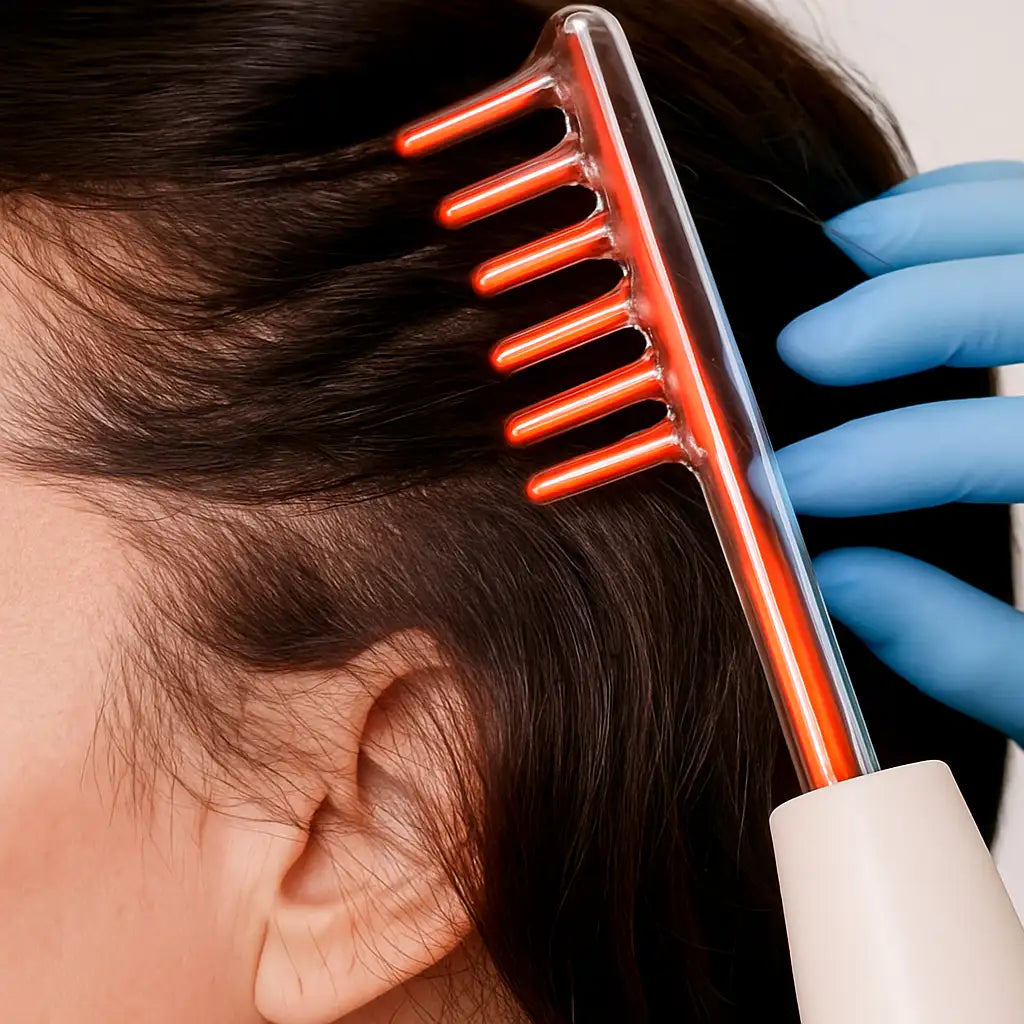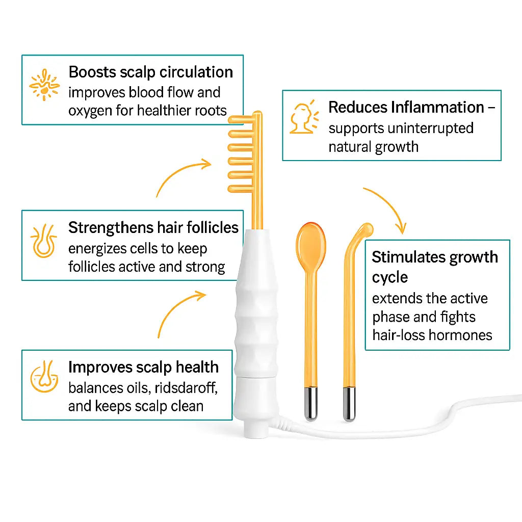 It uses gentle high-frequency technology that boosts circulation, energizes hair follicles, and helps reduce pimples by targeting bacteria. This supports both healthier hair growth and clearer-looking skin.