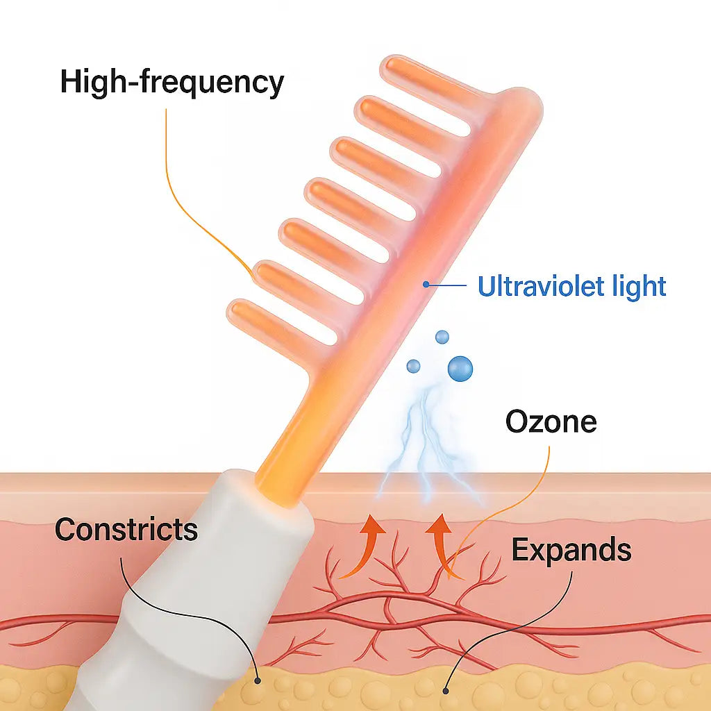 This high-frequency comb electrode works by delivering gentle electrical currents that generate mild ultraviolet light and ozone. The process causes blood vessels to alternately constrict and expand, improving circulation and oxygen supply. At the same time, ozone provides strong antibacterial and anti-inflammatory effects, helping to kill acne-causing bacteria, calm irritation, and promote healthier scalp and skin.