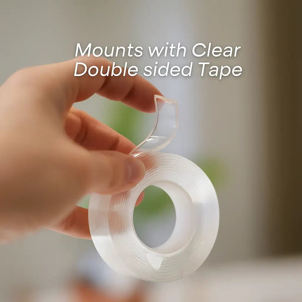 Just peel and stick using the strong clear adhesive provided. No drilling, no screws, no wall damage.