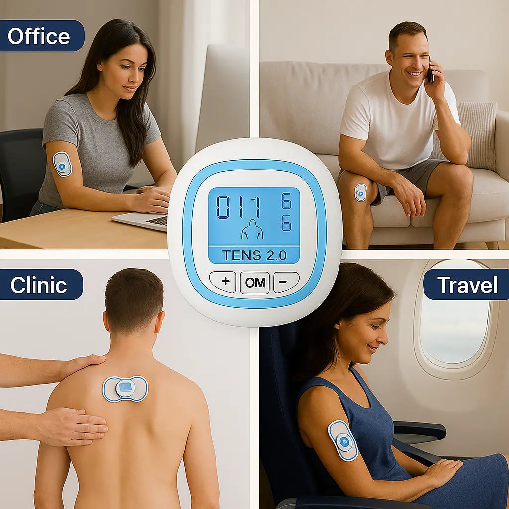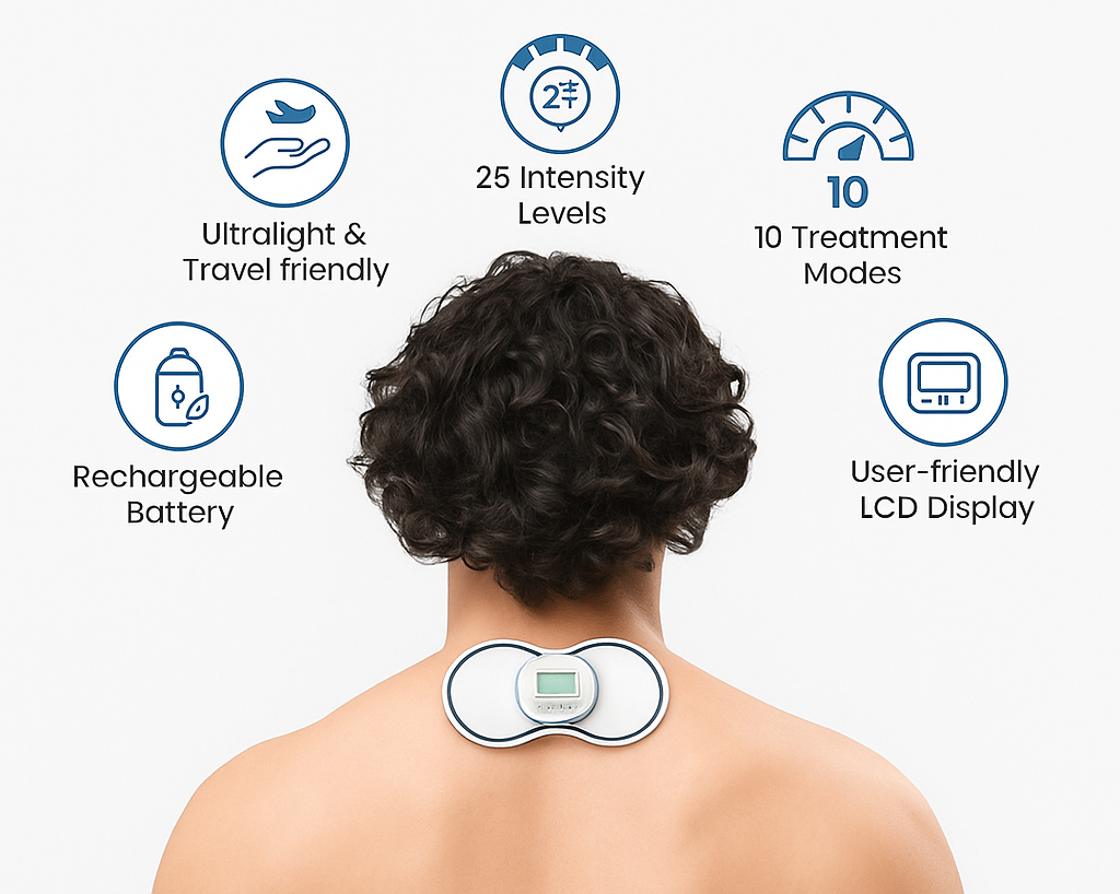 It sends gentle electrical pulses to block pain signals and relax muscles, giving natural, drug-free relief.